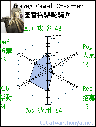 圖雷格是撒哈拉沙漠中以放牧駱駝為生的剽悍獨立遊牧部落,他們用獨特靛藍布巾遮住大半面部,並以此得名。這些矛兵騎術出色,為精銳沙漠騎兵部隊。由於駱駝惡臭能使戰馬驚懼,令他們與敵軍騎兵搏殺時勝算頗高。