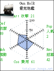 Gun Holk 霍克炮艦 light ship An upgraded Holk, armed with cannons in the fore castle and extra marines armed with gunpowder weapons. 霍克炮艦在霍克戰艦基本設計 上進行改進,前後甲板安置重 型火炮,同時配備大量火槍部 隊。